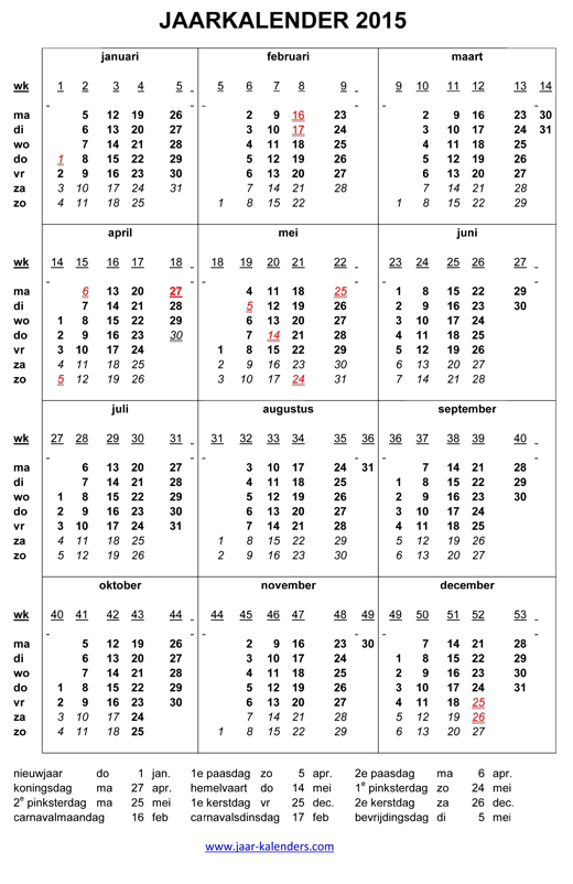 U kunt de jaarkalender van 2015 downloaden in word doc formaat en dan kunt u de jaarkalender zelf aanpassen knippen en plakken voor eigen gebruik en belangrijke datums aanpassen en uw verjaardagen en feestdagen er zelf in plaatsen. Of er een zelfgemaakte jaarkalender 2015 van maken. Rooster planning planrooster maken werktijden weeknummers met de kalender van 2015. Veel plezier er mee.