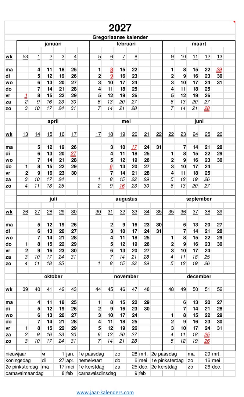 U kunt de jaarkalender van 2027 downloaden in word doc formaat en dan kunt u de jaarkalender zelf aanpassen knippen en plakken voor eigen gebruik en belangrijke datums aanpassen en uw verjaardagen en feestdagen er zelf in plaatsen. Of er een zelfgemaakte jaarkalender 2027 van maken. Rooster planning planrooster maken werktijden weeknummers met de kalender van 2027. Veel plezier er mee.