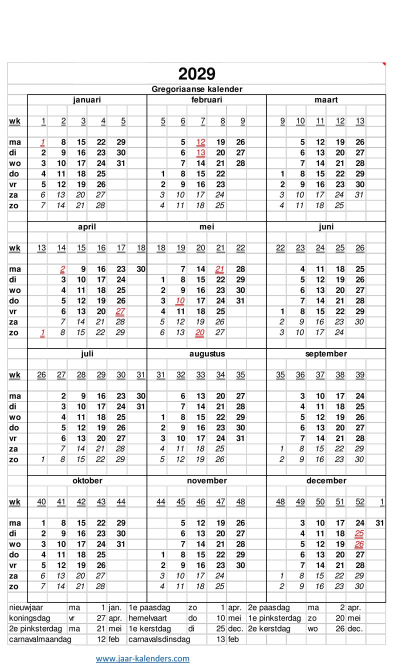U kunt de jaarkalender van 2029 downloaden in word doc formaat en dan kunt u de jaarkalender zelf aanpassen knippen en plakken voor eigen gebruik en belangrijke datums aanpassen en uw verjaardagen en feestdagen er zelf in plaatsen. Of er een zelfgemaakte jaarkalender 2029 van maken. Rooster planning planrooster maken werktijden weeknummers met de kalender van 2029. Veel plezier er mee.